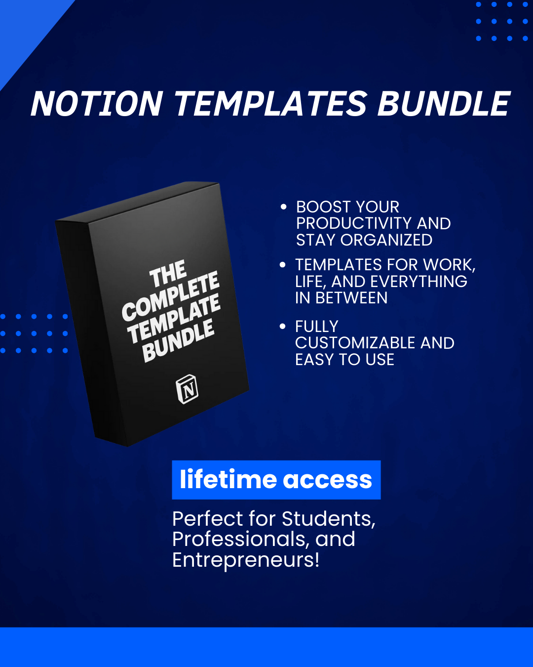 Boost your productivity and organization with the Notion Templates Bundle Ultimate Pack—a comprehensive collection of professionally designed templates tailored for personal, academic, and business use. Whether you’re a student, entrepreneur, freelancer, or content creator, this bundle offers everything you need to streamline your workflow and enhance efficiency.